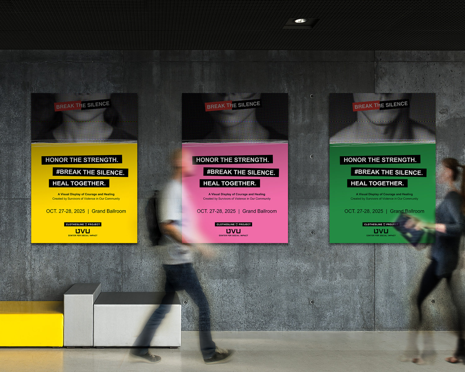 The Clothesline Project was a social awareness exhibition led by Utah Valley University. I was responsible for the full branding of the event—designing all visual materials, including print, signage, and motion graphics—to create a cohesive and impactful experience.